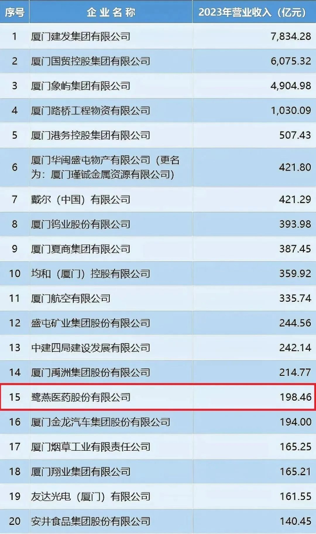 2024年11月,廈門企業(yè)和企業(yè)家聯(lián)合會(huì)發(fā)布2024廈門企業(yè)百強(qiáng)榜單,鷺燕醫(yī)藥股份有限公司榮列第15位!