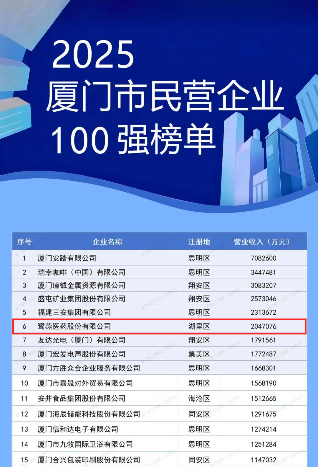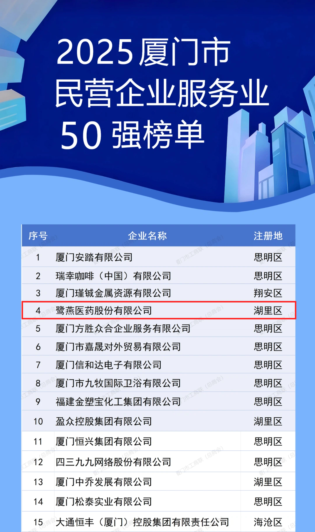 11月1日上午,2025年廈門企業(yè)家日大會召開。大會發(fā)布了2025廈門市民營企業(yè)100強(qiáng)系列榜單,介紹了廈門市民營經(jīng)濟(jì)發(fā)展態(tài)勢和營商環(huán)境建設(shè)成效。鷺燕醫(yī)藥股份有限公司憑借上市企業(yè)綜合實力,榮膺“2025廈門市民營企業(yè)100強(qiáng)”第6位,以及“2025廈門市民營企業(yè)服務(wù)業(yè)50強(qiáng)”第4位。